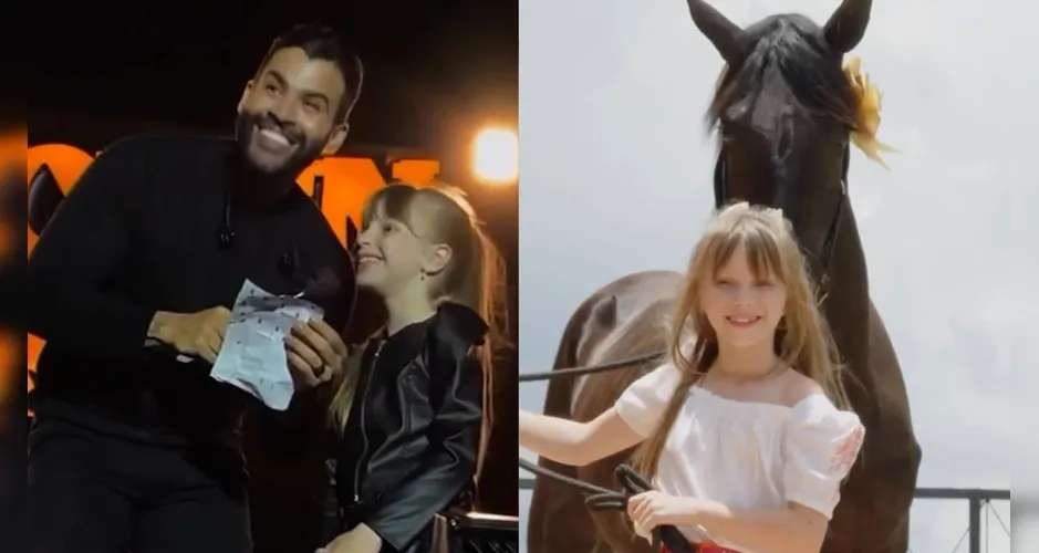 O cantor sertanejo Gusttavo Lima cumpriu a promessa feita a uma fã mirim e entregou, nesta segunda-feira (19), um cavalo de presente para a paranaense Isis Rafaelly Valentim, de 7 anos. A menina e sua família viajaram até a sede do haras do artista, em Bela Vista de Goiás (GO), para receber o animal, uma potra de pouco mais de um ano batizada de "Dominic".