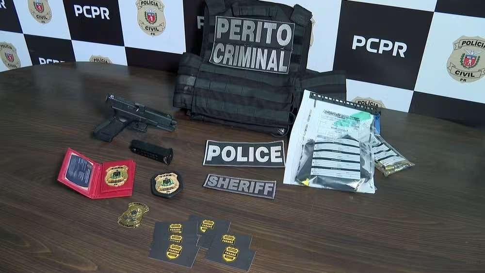 Na casa dele, os policiais apreenderam uma arma de fogo calibre 9 mm, municiada e com dois carregadores. Além disso, encontrou no local distintivos, camisetas e coletes balísticos com inscrições de "Perícia Criminal", simulando uniformes oficiais, e um simulacro de arma de fogo.