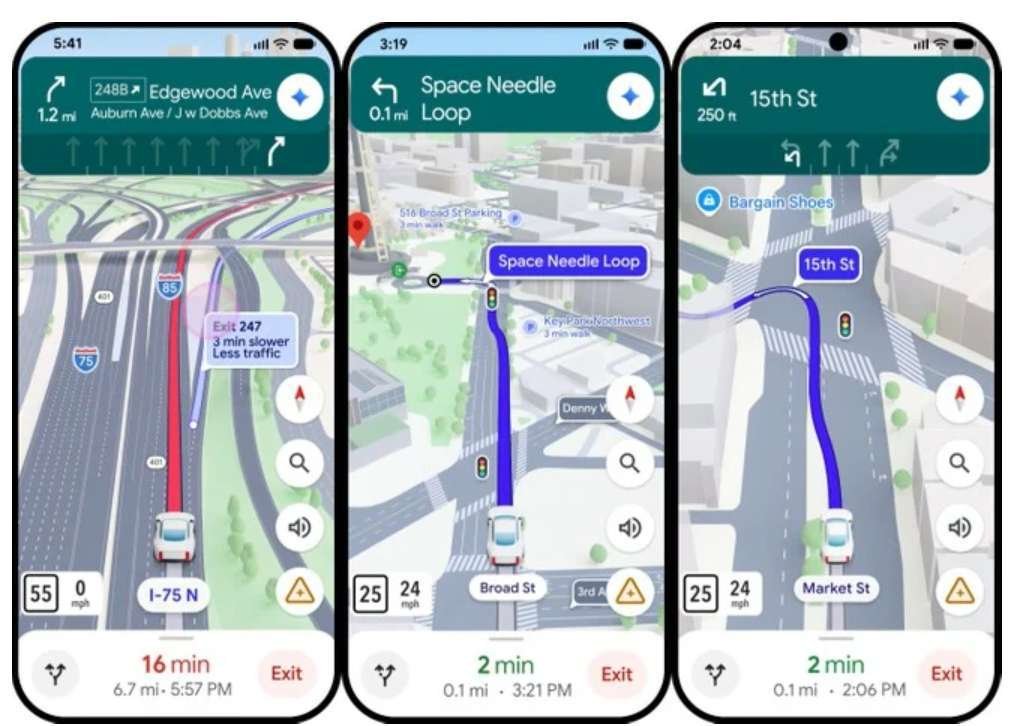 A tela do app passará a exibir uma visão 3D vívida do entorno, com prédios, viadutos, terrenos, construída a partir de imagens reais do Google Street View e de fotos aéreas processadas pelo Gemini.