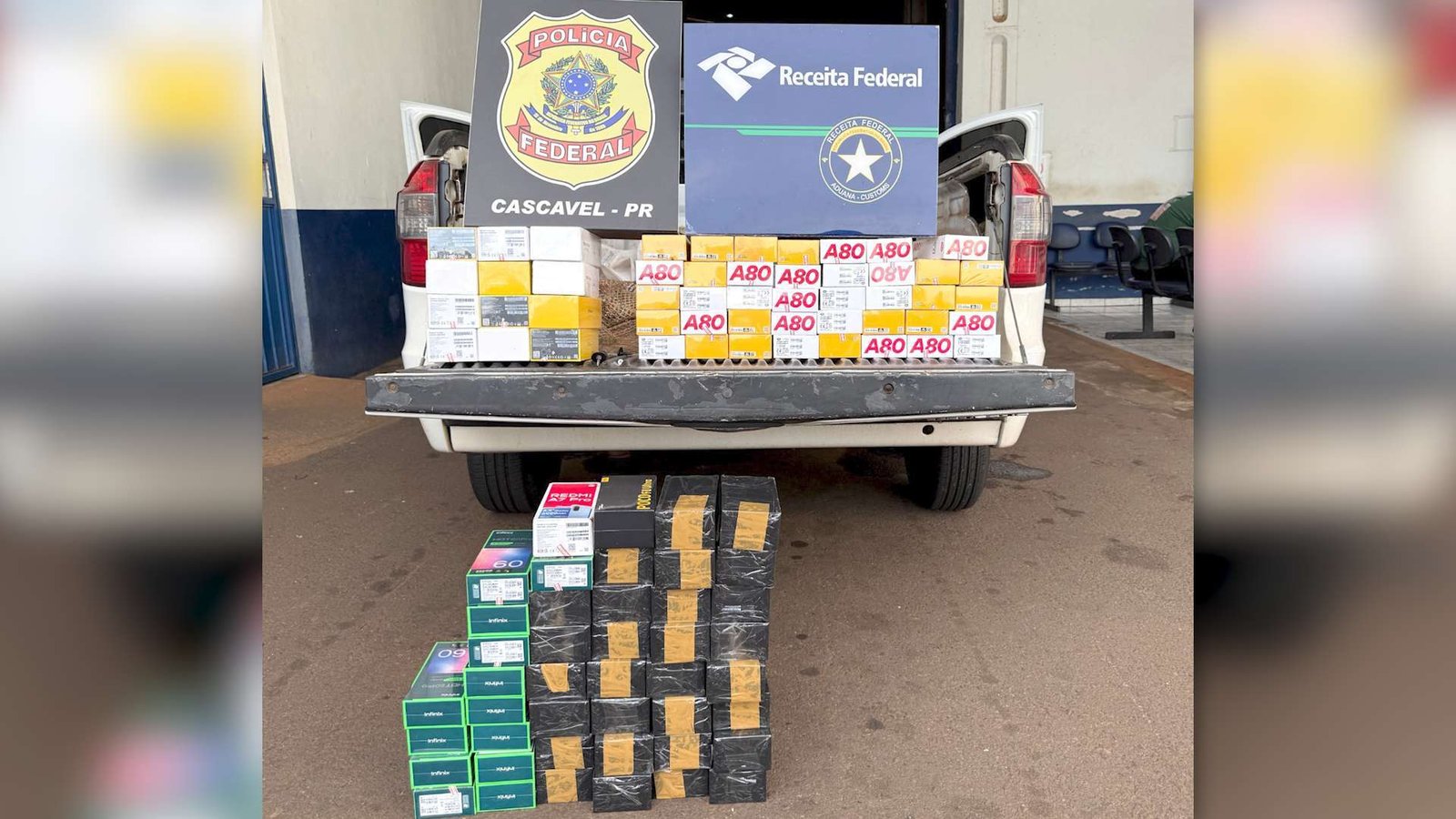 A equipe levou o veículo ao depósito da Receita Federal em Cascavel. Após a retirada da proteção da caçamba, os agentes encontraram compartimentos adaptados com os celulares da marca Xiaomi, avaliados em cerca de R$ 150 mil.
