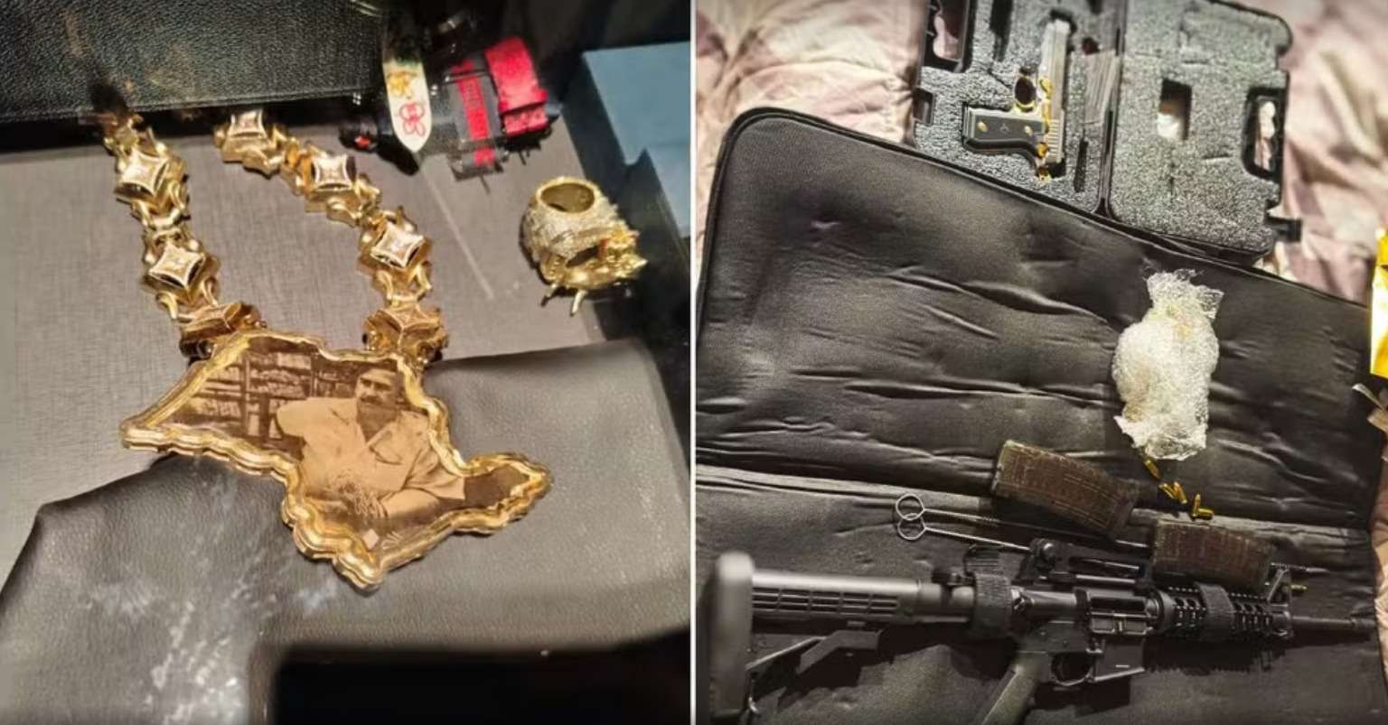 Um colar com a imagem do famoso traficante colombiano Pablo Escobar, dentro de uma moldura do mapa do estado de São Paulo, está entre os itens apreendidos pela Polícia Federal (PF) durante a megaoperação que mira uma organização criminosa suspeita de lavagem de dinheiro e transações ilegais superiores a R$ 1,6 bilhão (veja abaixo).