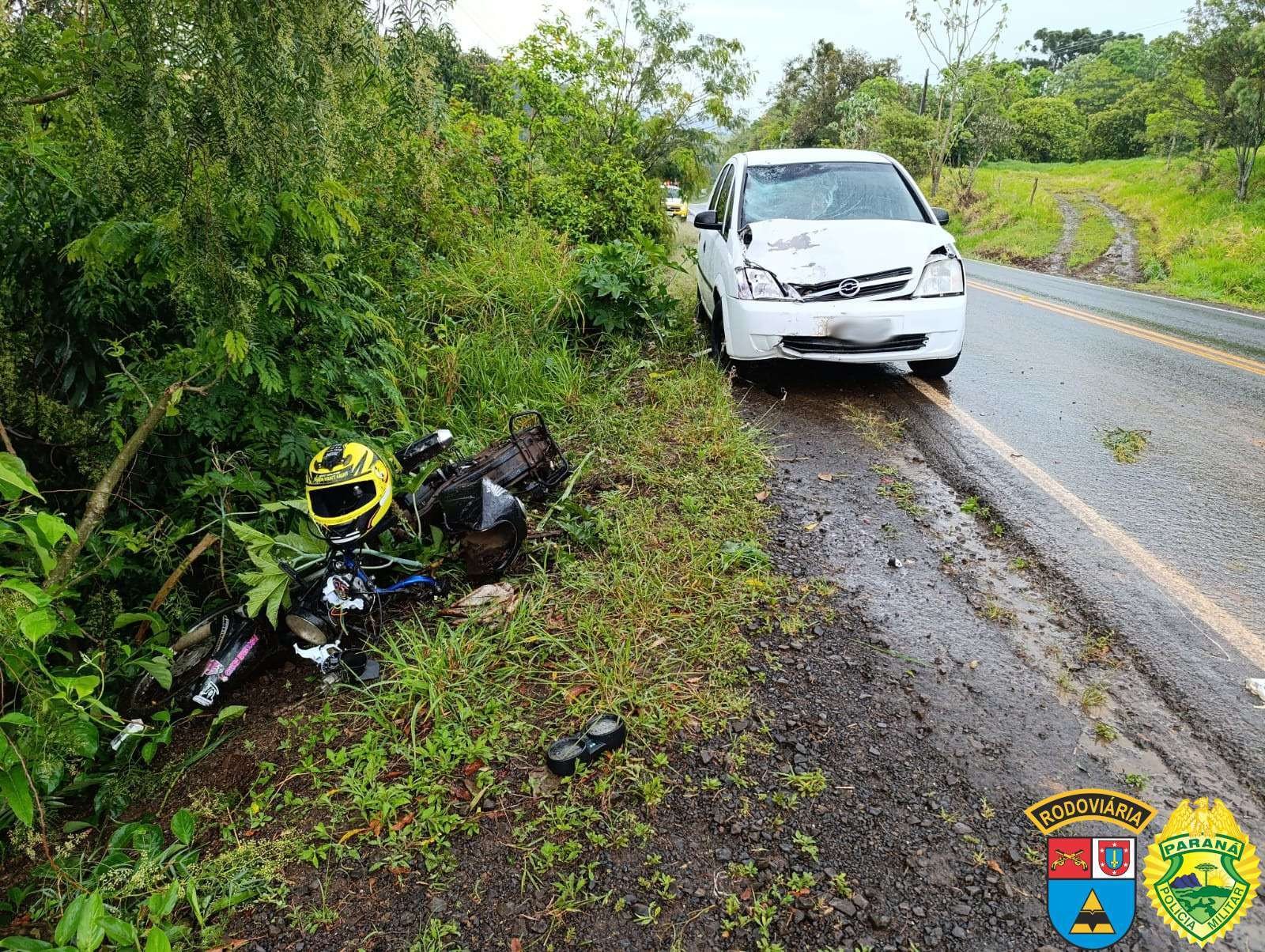 O acidente envolveu uma motocicleta Honda/CG 150 Titan e um automóvel GM/Meriva, que seguiam no sentido Usina Salto Santiago a Saudade do Iguaçu. Conforme apurado, os veículos acabaram se envolvendo em uma colisão traseira.