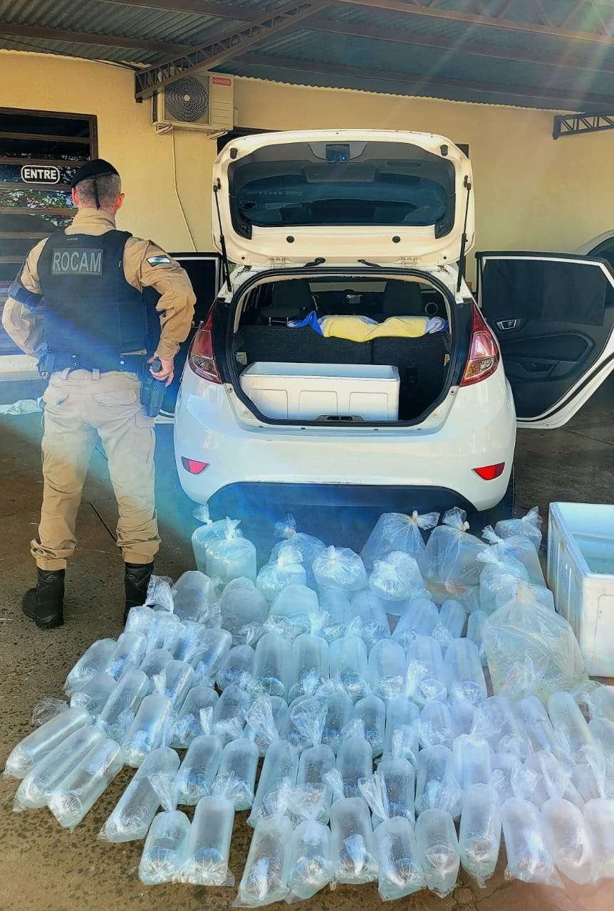 Durante a Operação Fronteira, a Polícia Militar do Paraná, por meio da ROCAM do 21º Batalhão, vinculada ao 7º Comando Regional, apreendeu 96 espécimes de peixes contrabandeados e prendeu um homem no município de Barracão. A ação ocorreu durante patrulhamento pela Avenida Arnaldo Busatto, quando a equipe visualizou um veículo Ford Fiesta com os vidros cobertos por tecidos pretos e a parte traseira visivelmente rebaixada, o que levantou suspeita e motivou a abordagem.
