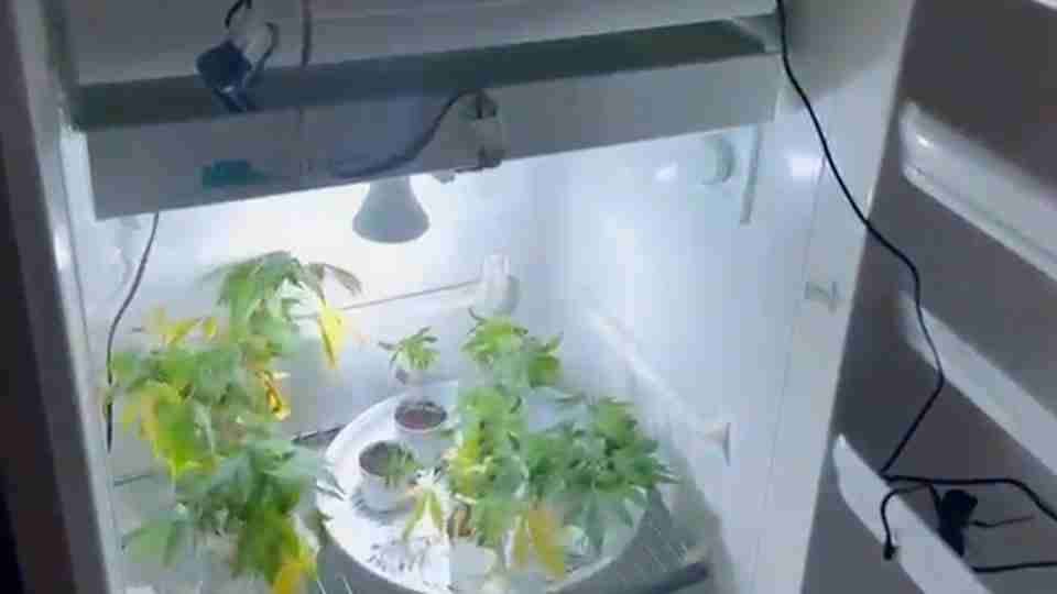 Dentro de uma geladeira, foram encontrados vários pés de maconha ainda pequenos. No andar superior, os agentes localizaram uma estufa montada para o cultivo, além de vasos com plantas já em estágio mais avançado.