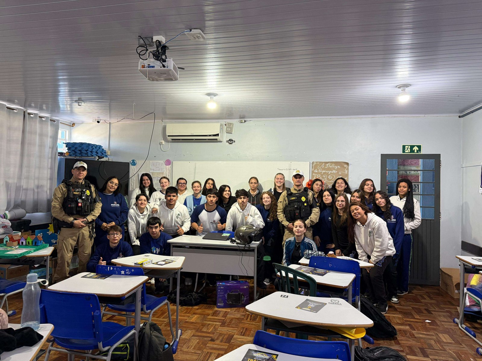Na manhã desta quarta-feira (24), o Pelotão de Trânsito do 21° Batalhão da Polícia Militar (21°BPM), vinculado ao 7°CRPM e à 1ª Companhia, realizou mais uma ação do Projeto Jovem no Trânsito. O encontro aconteceu com 25 alunos do Colégio Telmo Octávio Muller, no município de Marmeleiro.
