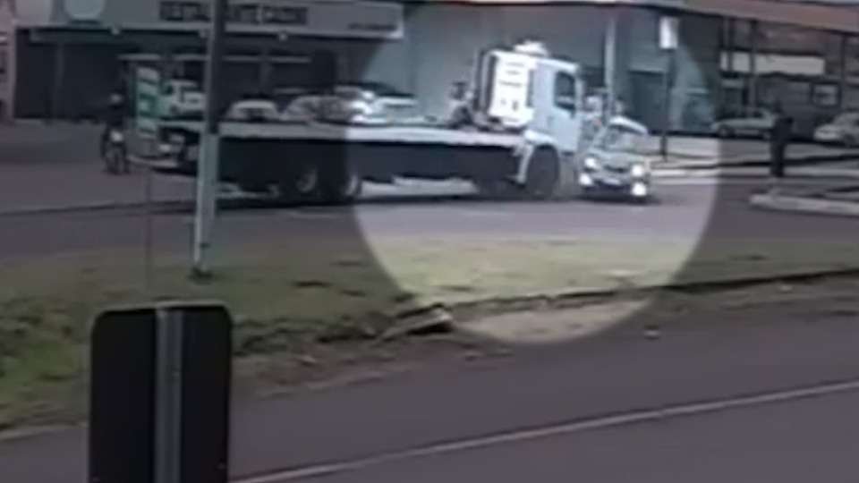 A gravação mostra o momento em que o Toyota Corolla sai de um posto de combustível, tenta atravessar a rodovia e é atingido por um caminhão plataforma. A força do impacto quase alcançou um pedestre que estava no canteiro central.